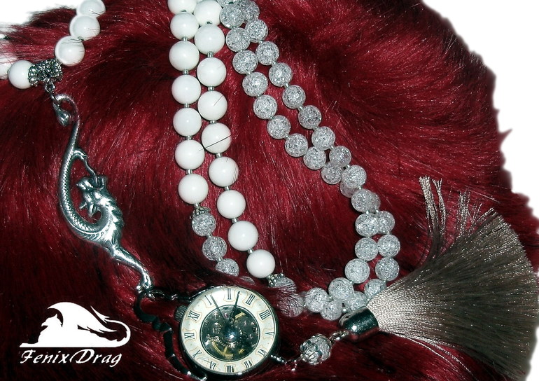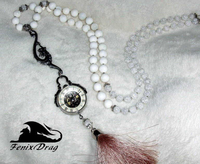 Сотуар (колье / ожерелье с кулоном) "Зима серого волка" со снежным кварцем и белым кораллом, с часам