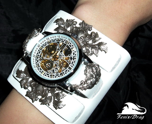 Широкий белый кожаный браслет "Безымянный рыцарь" с механическими часами в стиле Стимпанк / Steampunk