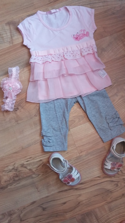 4. Комплект с футболкой Турция. Одели один раз 92, можно носить от 80. 700р. Сандалики сказка в идеале 600р. Повязка в подарок при покупке комплекта.