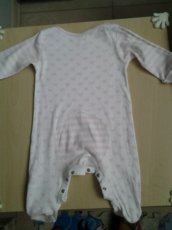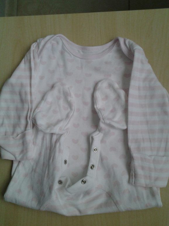 Слип 6-9 мес. очень милый, девичий, в сердечки и полоски, Mothercare. Кнопочки только внизу, для тех, кто любит расстегиваться самостоятельно)) На грудке небольшое чуть заметное пятнышко от яблока. 200р.