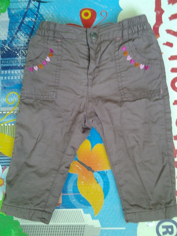 Утепленные брючки Mothercare 6-9, на самом деле скорее 6 месяцев, до роста 68-70см., коричневые с вышитыми сердечками. Резинка на поясе, зауженные штанины. Не линяют, хлопок. В жизни цвет ярче. В них спали в коляске на прогулке, поэтому состояние очень хорошее. 350р.