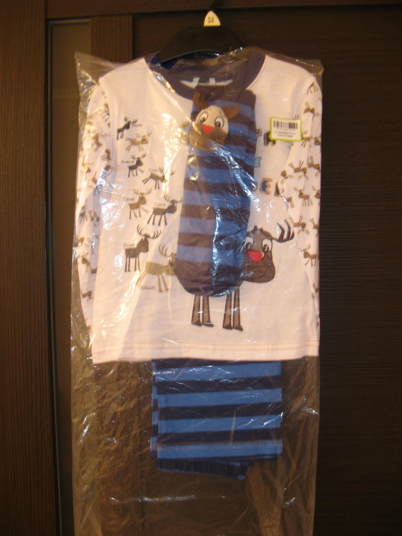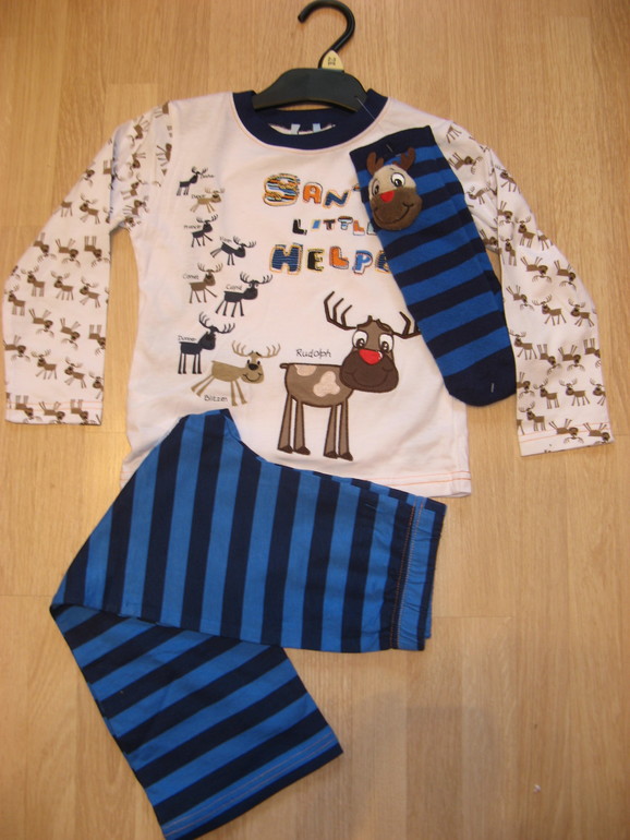 Пижама Новогодняя с длинным рукавом фирмы F&F. Белая кофточка, впереди рисунки и аппликации Оленей + сине-голубые полосатые штанишки + махровые носочки с выпуклым Оленем и тормозками на стопе. Внимание, почти все без бумажных этикеток, тканевые ярлыки обрезаны, см.предпоследнее фото - кому на подарок, это важно!Продаются на вешалках и в пакетах.