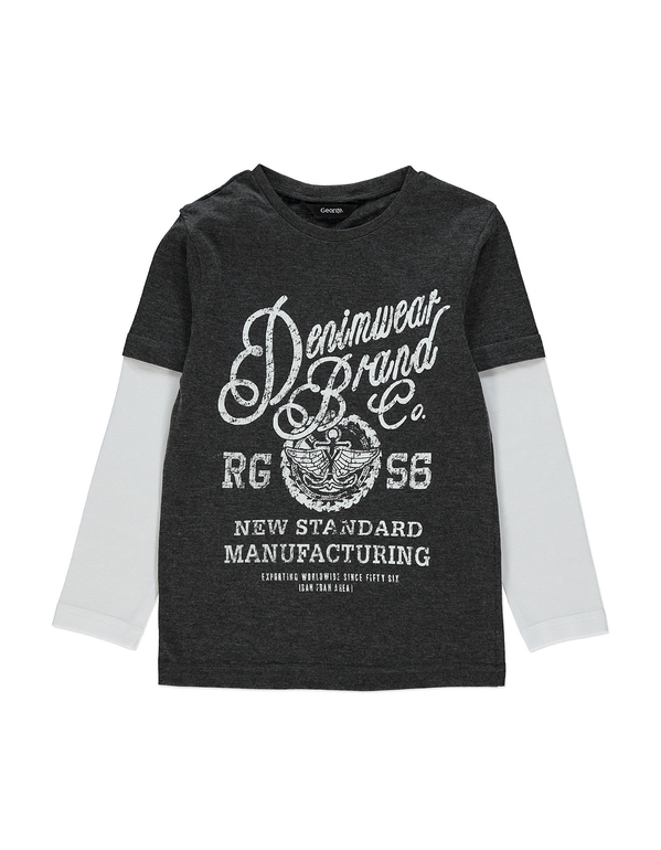 Кофточка с эффектом 2 в 1 фирмы Geprge. Темно-серая с белыми рукавами, впереди эмблема и надписи. Состав 68% хлопок, 32% полиэстер. размер 6-7л (160-122), 7-8л (122-128) 390руб