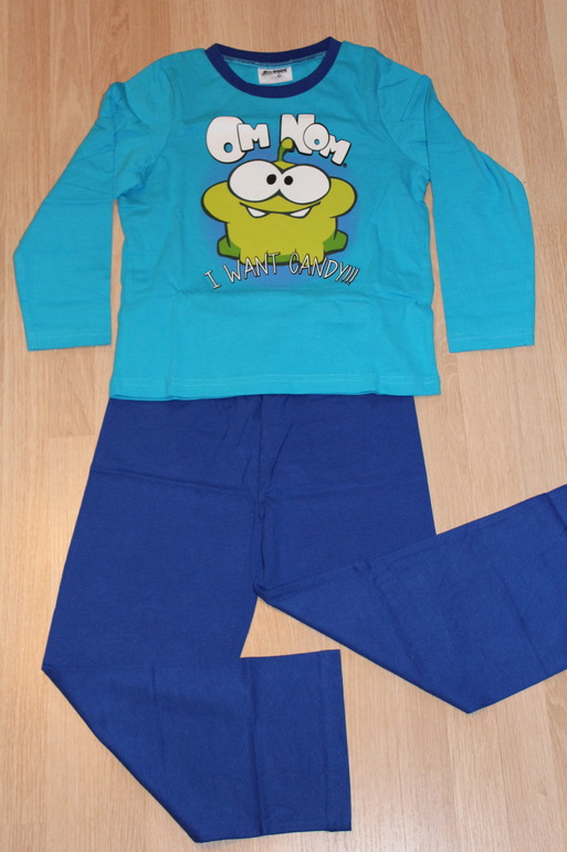Пижама с длинным рукавом фирмы Cut the rope. Ярко-голубая кофточка, впереди яркий рисунок Ам Ням и синие штанишки. состав 100% хлопок. Размер 3-4г (98-104), 5-6лет(110-116), 7-8л(122-128), 9-10л (134-140). 500руб.