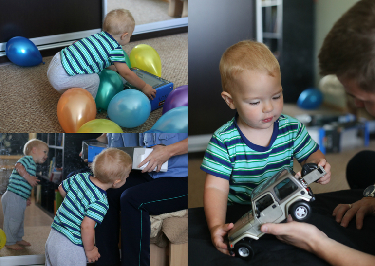Вот наконец светофор загорелся одновременно всеми тремя цветами, и наступил долгожанный День рождения! В куче разноцветных шариков именнинник неожиданно обнаружил... автомобиль! И побежали томительные секунды ожидания вскрытия заветной коробки :)))