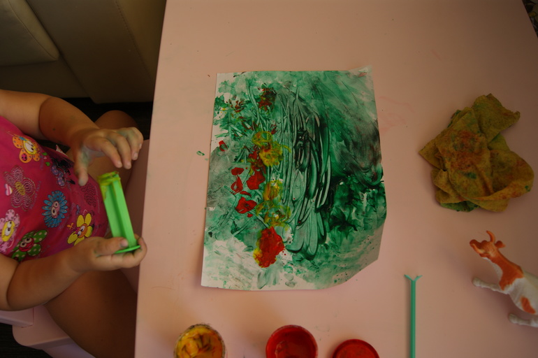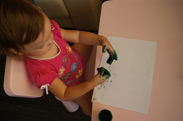 Рисовали луг для коровы. Сначала Маша настороженно отнеслась к испачканным рукам (она чистюля)
