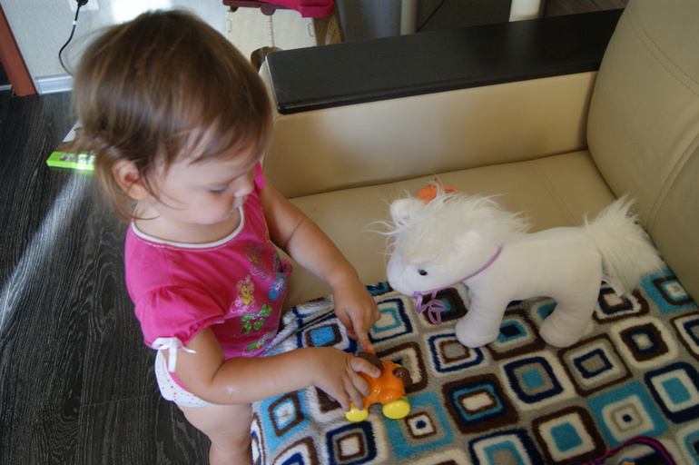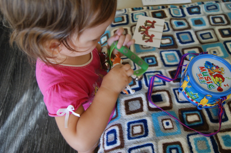 Поговорили о колокольчиках на шеи у коровки,посмотрели видео,послушали звуки. Маша хорошо усвоила,начала цеплять бубенчики на корову