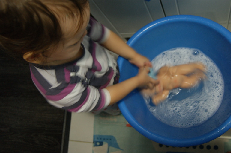 Наш заключительный день флешмоба от www.odin-k-odnomu.ru был связан с ванной. Проснулась наша кукла и Маша побежала ее умывать,затем купать в тазу и стирать ее вещи