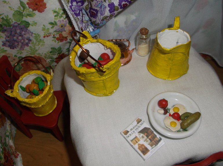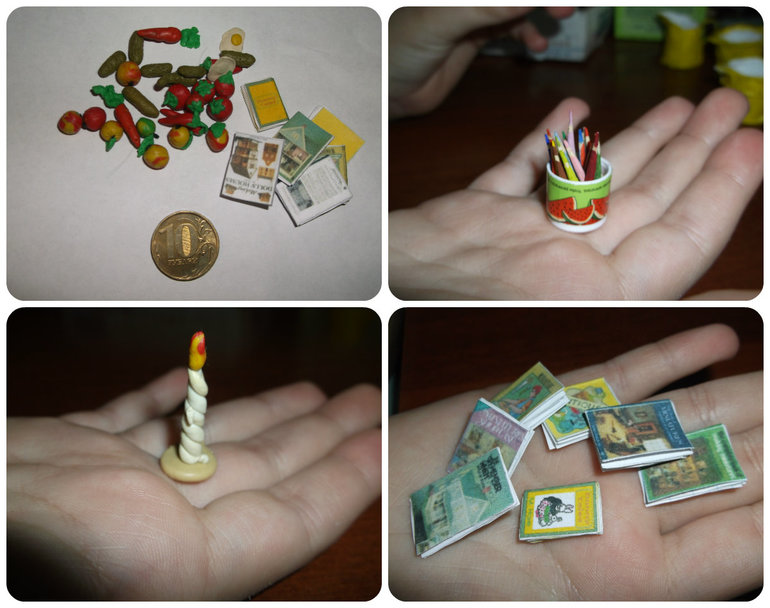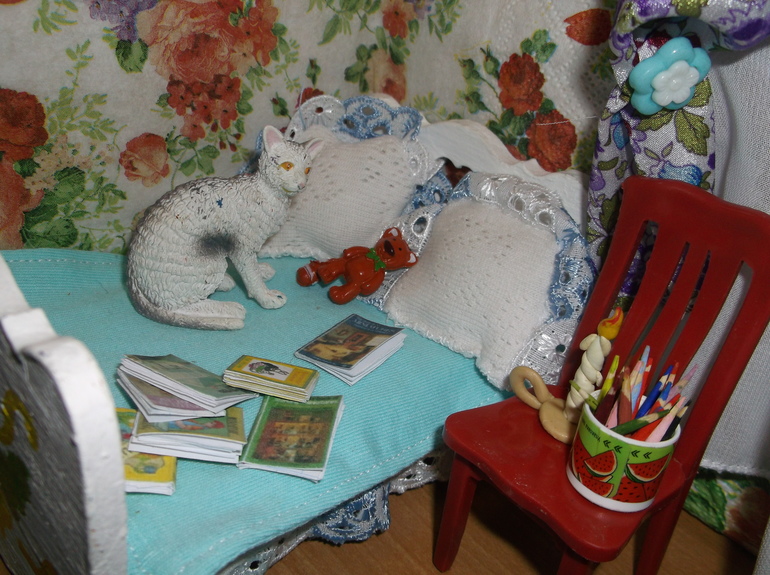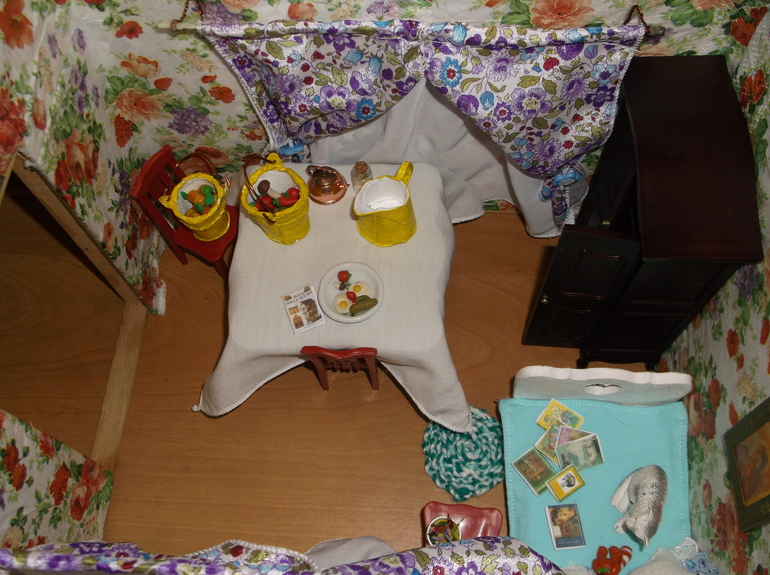 Обои из салфеток, карниз из спицы от зонта, еда из пластилина, книги распечатаны на цветном принтере, ведро и кувшин из картона, шторки и белье сшили, карандаши из зубочисток, часы из спичечного коробка (их нет на фото, в последний день сделали). Мебель готовая. Как на мой взгляд, деталей маловато, можно было больше проработать, но сказалась нехватка времени... Ну, убили двух зайцев сразу: и в кукол поиграли и проект сделали)))