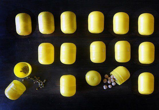 Нужно наполнить капсулы разным составом, например крупой, пуговицами, бусинами и т.д. Должно быть по две капсулы с одинаковым составом. В игре нужно взять капсулу, потрясти и найти в куче такую же по звучанию.