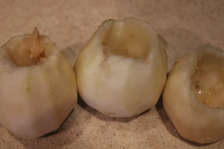 Я почистила четыре средние спелые груши и на всякий случай одно яблоко, срезала верхушки и принялась вычищать серединку. И скажу я вам, это тот еще геморрой, вычистить серединку у спелой груши среднего размера! Груши мягкие и наровят лопнуть в руках, а диаметр верхушки явно меньше диаметра чайной ложки. Хотела бы я поглядеть на этого автора, позиционирующего свой рецепт как тяп-ляп и все в шоколаде!