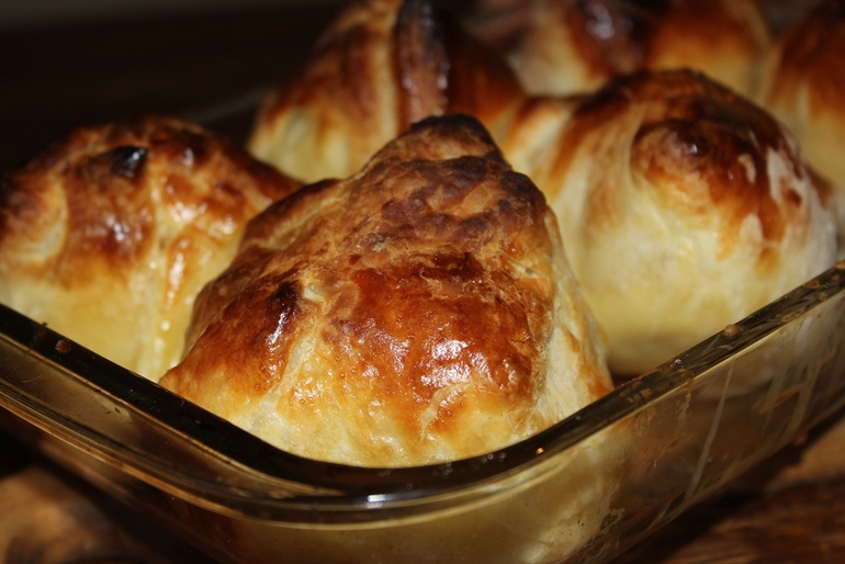 Запеленутые груши ставим в жаропрочную форму, смазываем взбитым яйцом и в разогретую духовку дожидаться умопомрачительного аромата и хорошей хрустящей корочки.