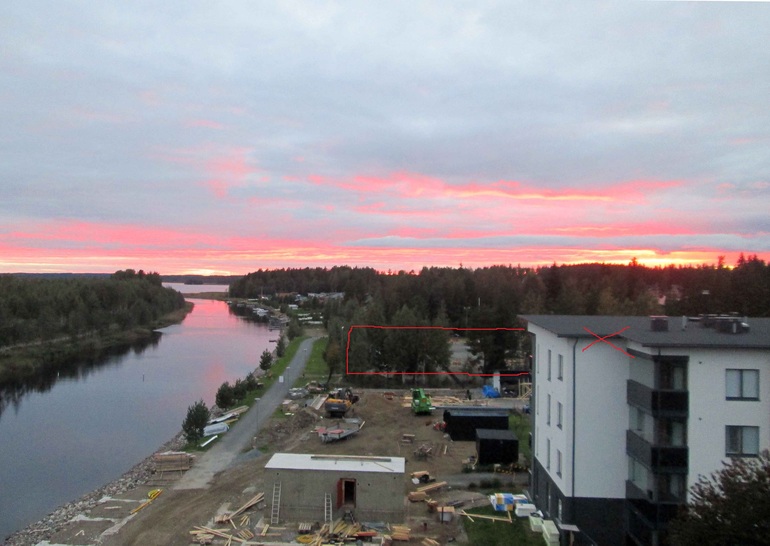 Сад от нас в 5 мин. ходьбы с коляской (без коляски еще не ходили), одна я вообще за минуты 3 дохожу. Часть площадки видно с балкона, но без бинокля все-равно ничего не разобрать)) Площадка разделена на территории, что очень хорошо, т к нам она хорошо знакома, мы часто туда ходили и раньше гулять в вечернее время и ходили по всей территории, но там есть лазалки для детей постарше, на которых мы страховали Даниэля вдвоем, но в саду же никто за ним бегать не будет, поэтому у малышей свой "загончик")) Уличных игрушек просто море, половина того, что я и сама хотела приобрести Даниэлю, но теперь необходимость в этом отпала:) Дверь в кладовку открыта всю прогулку и любой ребенок может зайти и взять все, что ему захочется) После прогулки все убирается в кладовку. Вообще, площадка мне нравится, у них там даже есть свой лесочек с тропинками! Правда сад стоит на берегу канала и там постоянно очень ветрено, но, в принципе, в нашем районе всегда ветрено:) Вид с наших окон и балкона. На фото красным я обвела забор площадки, а крестик означает примерное местоположение самого сада, который скрывается за домом. Кстати, раньше на месте белого дома и стройки был лес, хорошо, что мы его уже не застали, а то было бы особенно обидно)