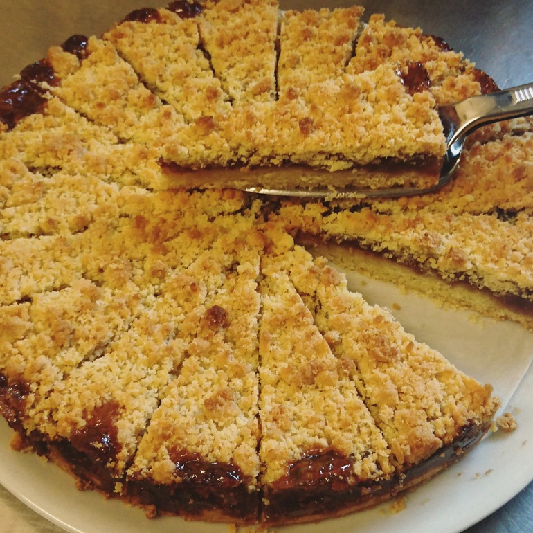 Выкладываем 2/3 крошки в форму (ок 22 см диаметром), крошим сверху печенье, выкладываем варенье и распределяем равномерно ложкой. Сверху посыпаем оставшейся 1/3 крошки, выпекать в разогретой до 180 градусов духовке 30-35 минут.