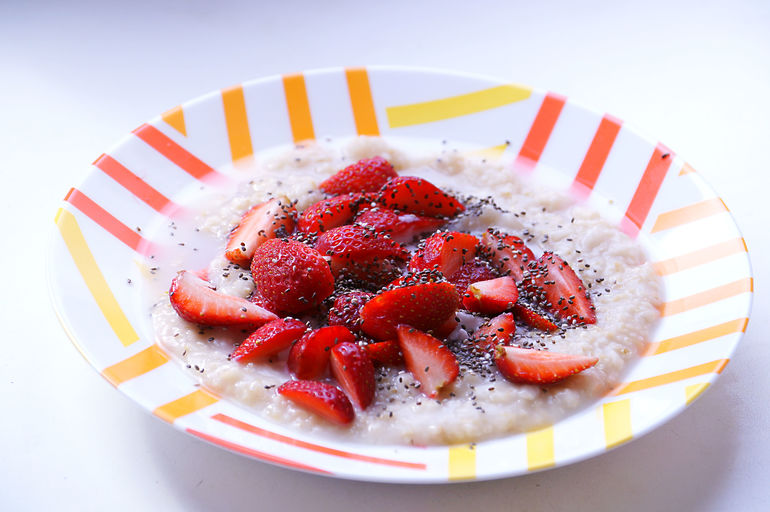 Каши присутствуют, но не часто. Овсянка на кокосовом молоке с клубникой и чиа