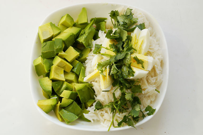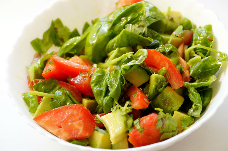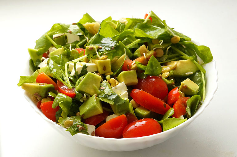 Или шпинат, помидоры, авокадо, проростки чечевицы, Фета, зелень, льн. семечки