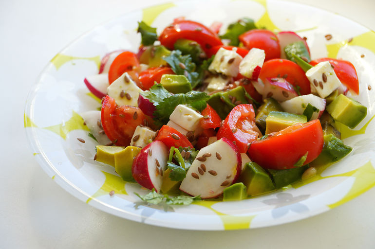 Помидоры, авокадо, красный перец, зелень, семена чиа, льняные семечки