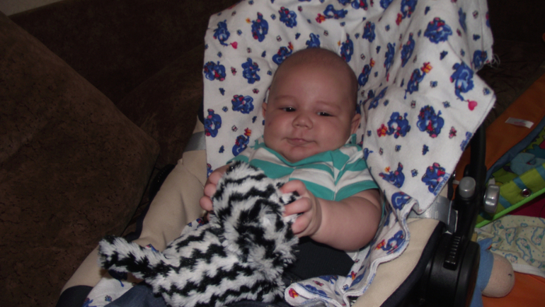 Голову стал держать совсем хорошо. Даже не заметила, когда перестала ее немножко поддерживать в положении столбиком. Реально, не помню, когда… На животике лежать не очень любит, но раз в день выкладываю и отвлекаю танцующей коровой. Это я не про себя, это игрушка такая, если че. Если не контролировать, быстро заваливается на бок. Не переворачивается, а именно заваливается.