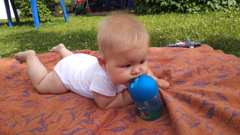 Пьет детский чай из поильника с трубочкой. Может держать его сама двумя ручками (но, конечно же, предпочитает, чтобы ей подержали). Интересно, что бутылку с соской она так и не взяла, а трубочку сразу получилось, с первого раза.