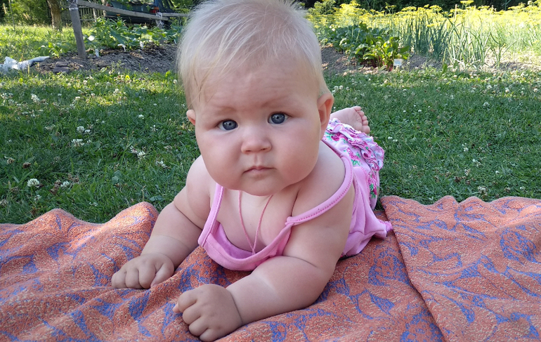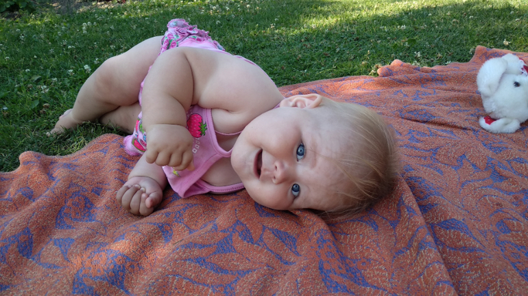 По двигательным умелкам все также очень медленно.. Передвигается по комнате перекатами с живота на спину. Как колобок. Причем катится целенаправленно. Иногда вижу попытки приподнять зад и согнуть ноги, но не получается пока совсем.