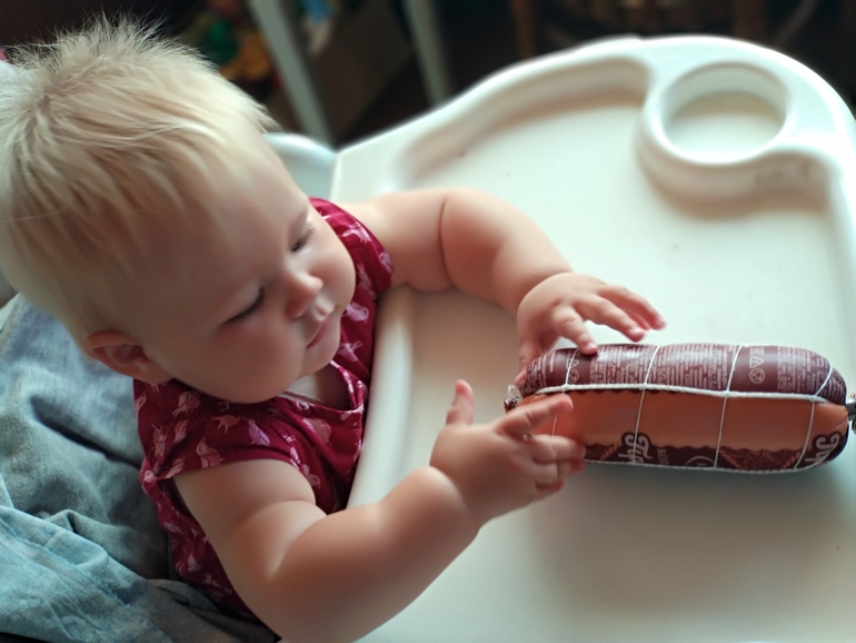 В этом месяце прикорм пошел веселее. Я стала в безмолочную кашу подсыпать немножко молочной, а овощи чуть подсаливаю и добавляю каплю оливкового масла. Аппетит сразу попер по нарастающей)) Плюс радостно был встречен биолакт и потихоньку, но очень охотно пробуем мясо. И огрооооомный пищевой интерес к взрослой еде со стола. Чем бесстыдно пользуется папа, когда я отвернусь, вводя в Евин рацион крем с торта, какао из своей чашки, а также суп, жареную картошку и копчёные колбаски. 👿👿👿