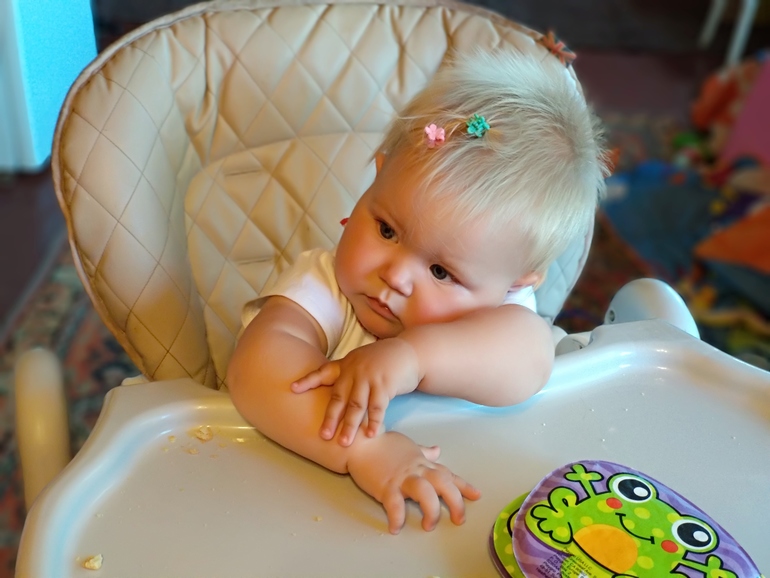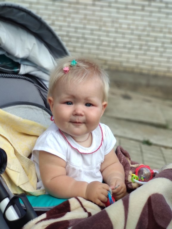Что меня безмерно радует, дак это ее позитив. Ева улыбака ну просто абсолютная. Всем и всегда рада, сияет от счастья, как медный таз, когда с ней разговаривают, на руки берут. Все время сравниваю из с троюродной сестричкой (соседка по даче). Вот реально они два противоположных смайла - наша вечный улыбахен, а та постоянная печалька. Та миниатюрная худышечка и энерджайзер. А наша зефирная неторопливая пампуха.