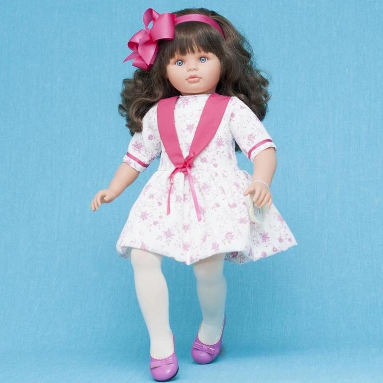 Кукла очень большая, 57 см и выглядит, как живая девочка. У нее густые и блестящие волосы, мягкие и послушные, как шелк. Их можно расчесывать и делать разные прически.