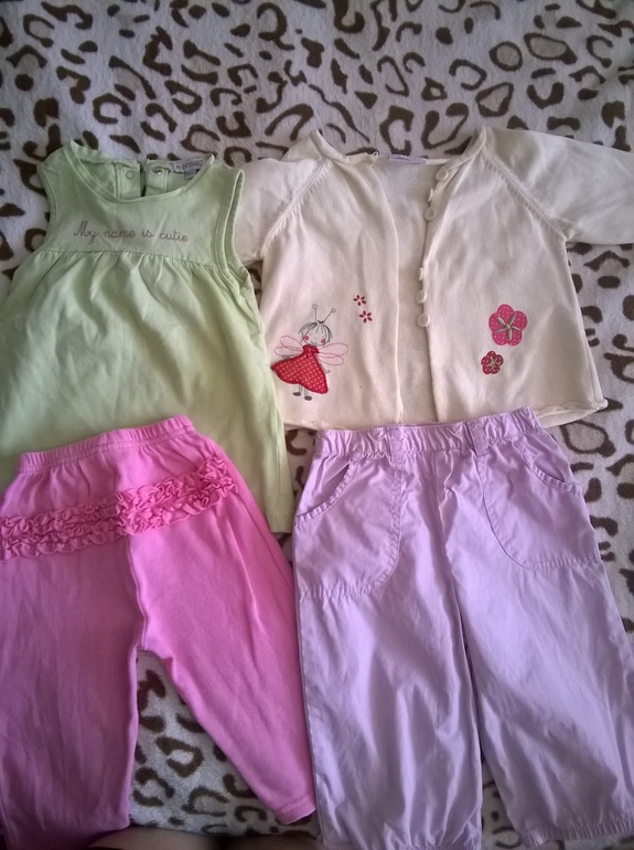 Платьице на рост 80, кофточка хлопковая 74, но пойдёт до 80-86 легко, штанишки на рост 74-80, можно как бриджи. Положу ещё одни штанишки с рюшечками (постираны, их нет на фото), только рюшечки не на попе, а на ножках.