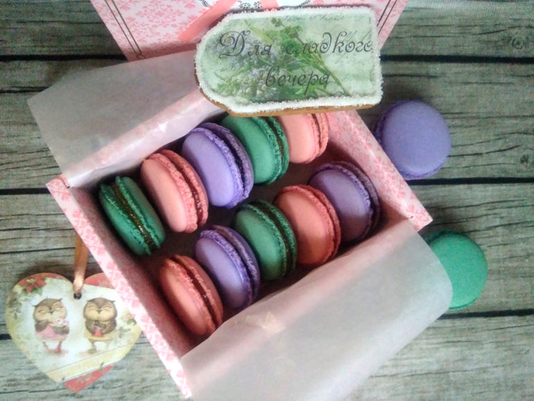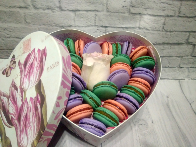 8. Набор пирожных макарони в коробочке-сердечке. 6 шт - 400р. Можно добавить поздравительную бирку с сахарной картинкой - 470р