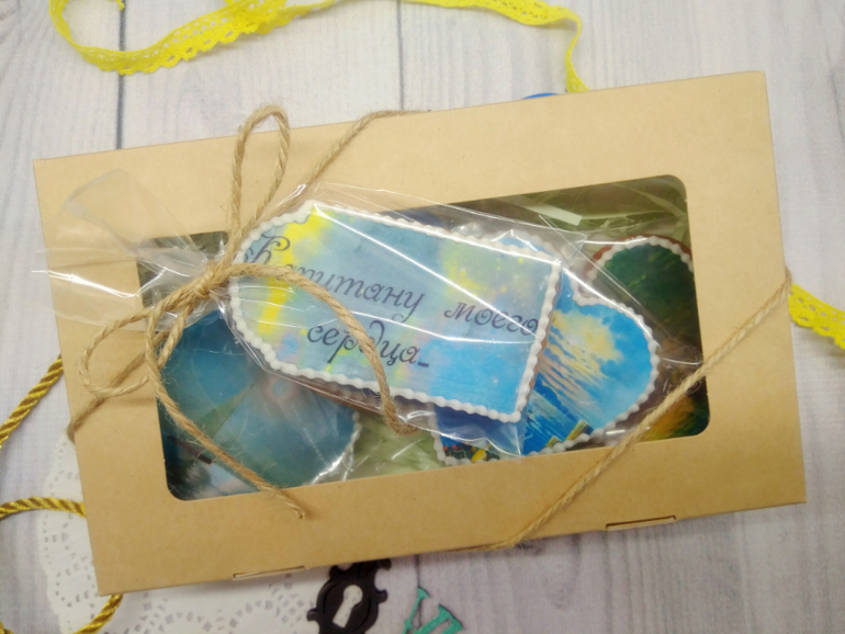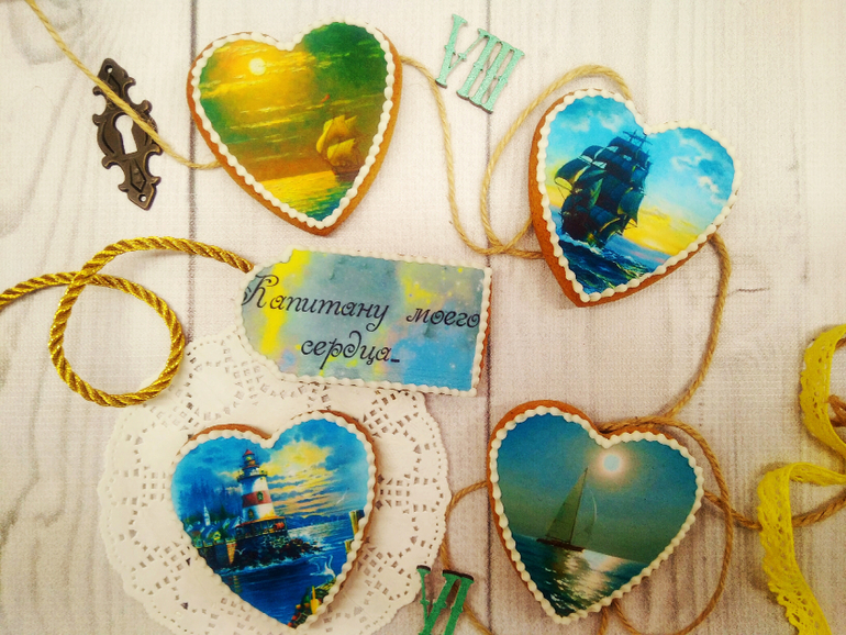 2. Набор "Капитану моего сердца". В наборе 4 сердца и поздравительная пряничная бирка с сахарной картинкой. Цена 500р