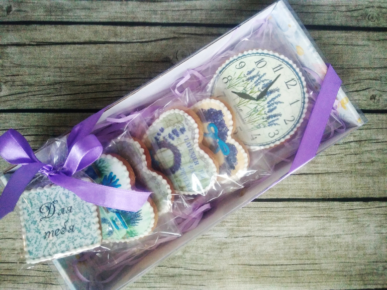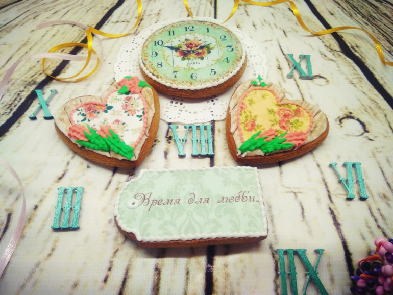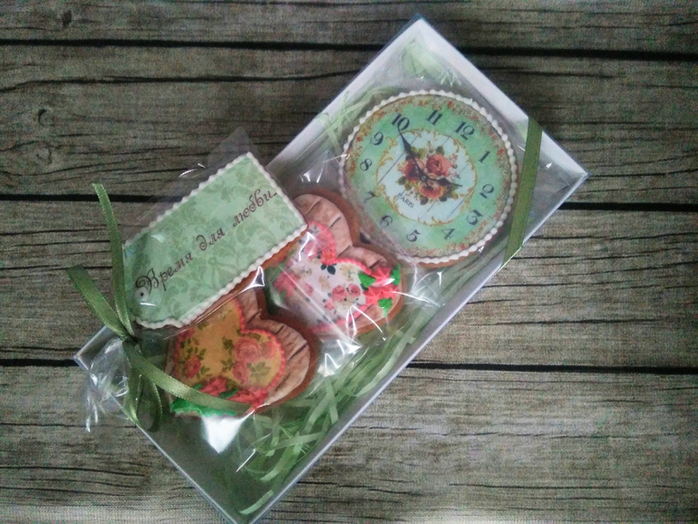 4. Подарочные наборы с часами. В наборе 4 или 2 сердечка и пряничные часы с пряничной поздравительной биркой с сахарной картинкой. Оба набора можно заказать в 2 вариантах - с 2 и 4 сердцами. 2 сердца и часы - 550р, 4 сердца и часы - 850р.
