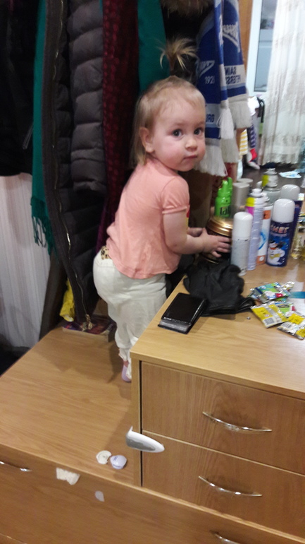 Еще Аня научилась везде залазить с помощью рук, даже если высоко и она ногу не может закинуть - руками ухватится и подтягивается. Сегодня, пока я развешивала белье сушиться, Аня залезла на тумбу