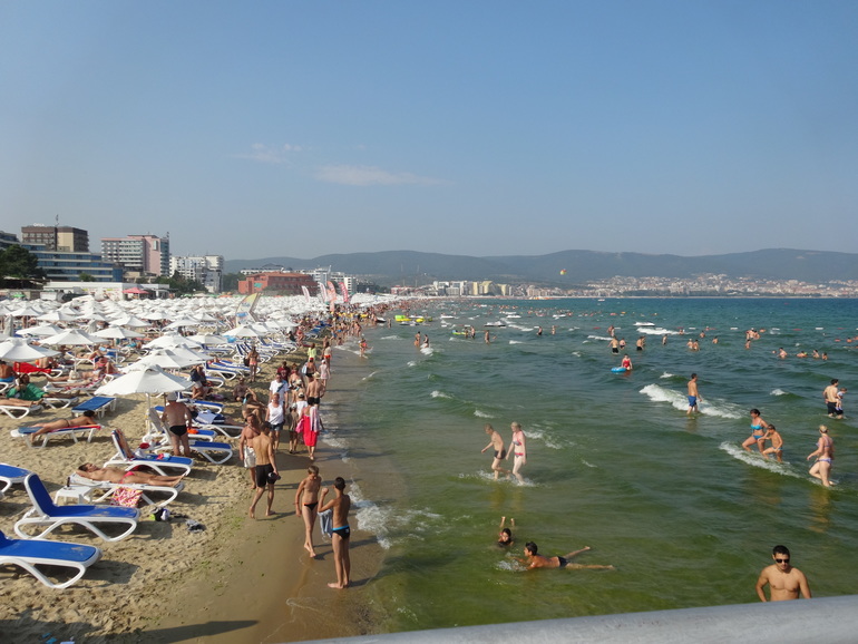 Для сравнения - фотография пляжа в Солнечном берегу. Лежак на лежаке, очень много народа. Море грязное.
