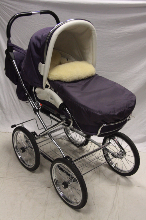 Данная модель выполнена в фиолетовом цвете с элементами отделки из кожи. Рама у коляски хромированная, оборудована ножным тормозом и корзиной для покупок.