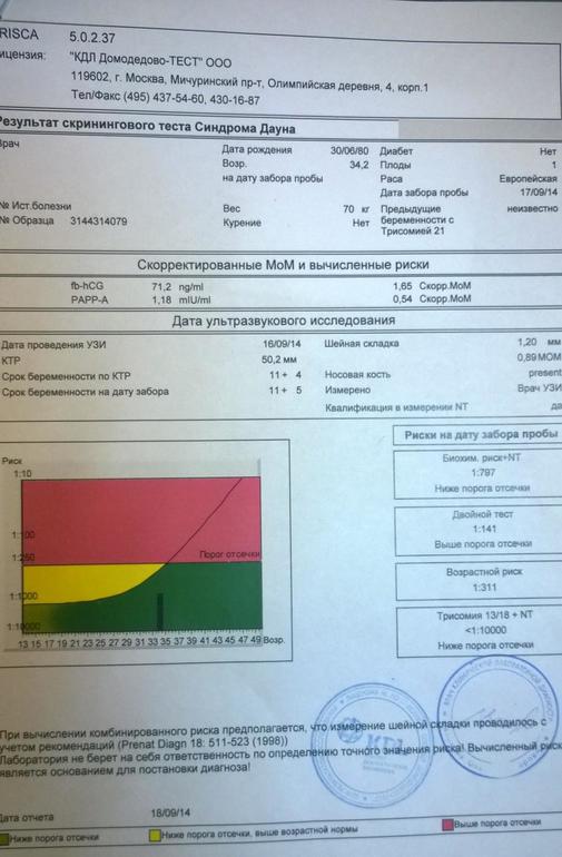 На скрининг поехала в Артмед, мне нравится у них проходить УЗИ, т.к. я сама все вижу, мне все показывают и рассказывают. Ребенок уже большой, 50,2 мм от головки до копчика, двигался постоянно, активный, врач сказала что у нас будет девочка, большая вероятность! Через три недели пойду повторно специально проверить пол) Так интересно было наблюдать за ней, ножки и ручки сгибает, один раз в ладоши хлопнула и показала все пять пальцев на ручке). Долго мы ее рассматривали, пересчитывали и перемеряли, врач хороший попался, она абсолютно любое движение комментирует и рассказывает. Вот результат, меня смущает показатель двойного теста, так и не нашла в интернете что это значит.