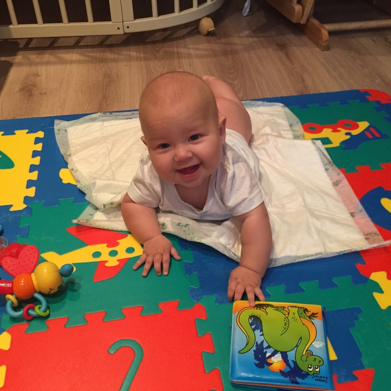 Снова пролетел месяц, время летит. Мы стали на один месяц старше. Чему мы научились за этот месяц: держать хорошо игрушки двумя руками, если на спине роняем, то сама может взять. На животе можем долго лежать, щупая все шершащее и звенящее. Перестала вставать на вытянутые руки, ноги знаем только до коленок. На животе пятимся назад или вокруг своей оси. Пропила 5 дней таблеток и поняла что сися доче что есть что нет, не влияет. Ночью кормила один раз в 4 утра она даже не просыпалась. Кстати про сон. Стали спать меньше ночью, ложимся всё так же в 20 часов, с укладыванием вообще все замечательно, поели, пижаму одели и в кровать, иногда сразу засыпает, иногда поерзает немного. Ночью зато стала просить есть в 3 утра! Редко в 4 и крайне редко в пять. Но на утренний прием еды не влияет такой сдвиг, всё равно первый прием в 9:30. Просыпаемся теперь в 6 утра!!! Так все хорошо было, вставала в 8 утра, теперь в 6, видимо чтобы мы школу не проспали. Днем спим по 30 минут, рекорд 40 минут, на сисе, если возьмет, то и два часа может. А так сейчас укладываемся в 8:30-9, 11-11:30, 13-15, 18-18:30. Если проснется в 17 часов то до 20 уже не укладываем и не просится. Только дневной сон у нас долгий, а так минимум 3 сна по 30 минут, иногда и 15. Коляску продали, решили обновить на прогулку, но ее так быстро купили, что я не была даже готова, теперь ребенок без коляски, пока не определилась что взять на зиму. Третий день дрищем, зеленый стул и кровяными прожилками. После еды сразу, и потом через 1-2 часа, больше 10 раз в день. Пьем бифидумбактерин, смекту, пока без улучшений, хотя эту ночь спали чуть лучше, чем две предыдущих, в первую вообще температуру поднялась 37,7. Я думаю на зубы, десны горячие стали, два зуба видно, но белой полоски нет, ребенок капризный бывает, слюней мне кажется стало меньше. Ждем педиатра, покажем наши какашки. Заочно у нас дисбактериоз. Кушаем также 5 раз по 200 мл, смекту ей очень понравилось из ложечки пить, глотает очень хорошо, прикорм пока не ввожу, думаю через месяц начнем. Вес на домашних весах 8200 гр Очень любим брать конфеты руками и класть в мисочку, самое любимое развлечение, держишь ее на руках, ноги ходуном ходят, стала разглядывать свои руки, крутит перед собой, Вся такая спокойная и неторопливая. Когда очень кушать хочет, то сама держит бутылочку двумя руками и ест. Я пока поддерживаю, под конец устает видимо. 27 августа покрестили.