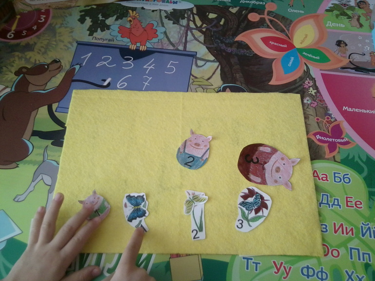 Филя нашел самого большого поросенка, самого маленького и вспомнил (о чудо!) их имена. Далее мы поразмышляли, что поросята делали летом, как они игрались (а сын у меня очень любит поболтать и порассуждать )). Посадили цветочки, тут полетели на них бабочки, а потом и сами поросятки присоединились.