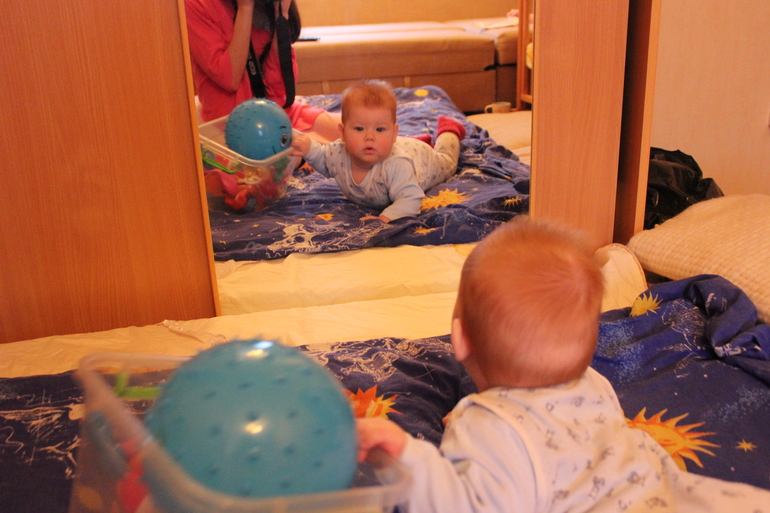 Так вот начали мы спорт когда Миху было 4 месяца, сначала он просто лежал в развивающем коврике и смотрел на мои тренировки, в глазах читалось недоумение, что это с матерью????