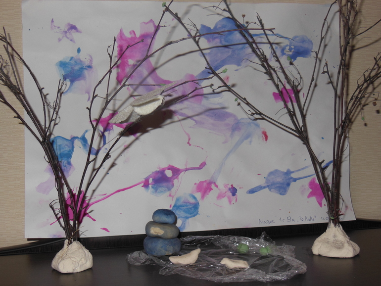 Втыкали веточки получились деревья, для столика времен. Потом, я на деревья немного листиков сделала. Ведь в народе о Сретении говорят: Весна встречается с Зимой.