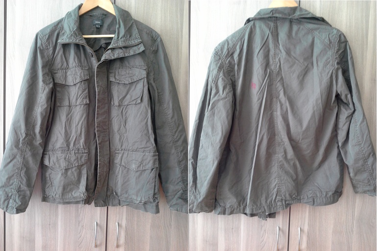 12. Ветровка, мужская, активно ношена, хорошо показала себя в дождь и ветер. Только если на даче или еще куда то, так как сзади краской испачкали, на фото видно косяк. М