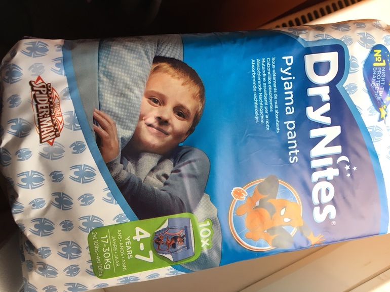 Но тут мне на глаза попались Трусики-Подгузники Huggies DryNites от 4-7 лет и я решила попробовать, риск конечно был большой , что не захочет надевать, но дизайн трусиков с человеком пауком (нашим любимым героем) спас ситуацию) И большой мальчик согласился их надеть)