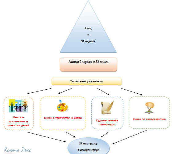 В году примерно 52 недели. Если количество недель разделить на 4 типа книг (цифра условна, у кого-то может получиться больше или меньше), то получается - в каждой сфере, вы прочитаете 13 книг за год.