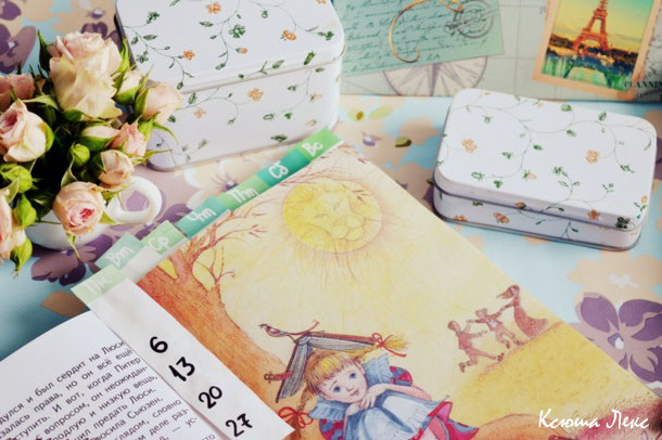 Цветные закладки-разделители.Один раз в неделю (в воскресенье), я приклеиваю закладочки и рассчитываю количество страниц, которые я в день должна прочитать.