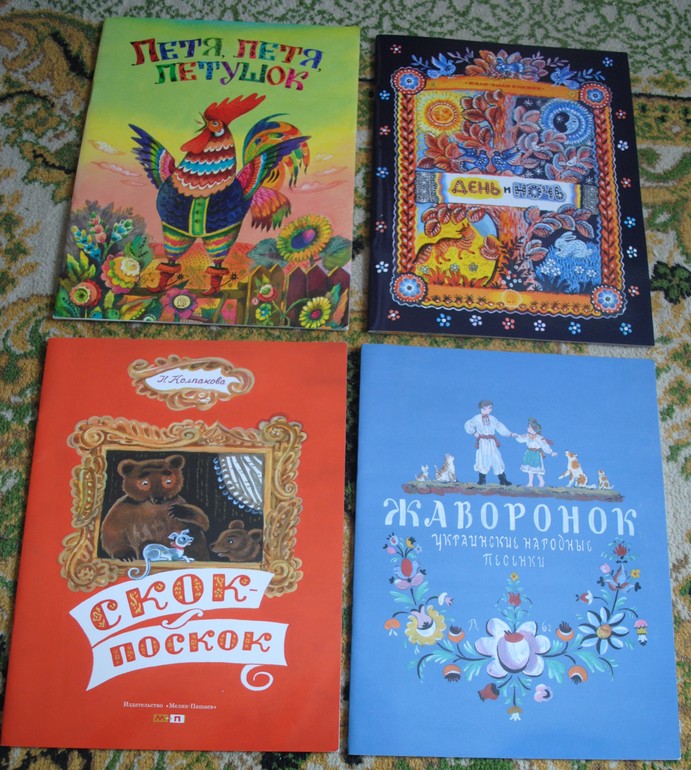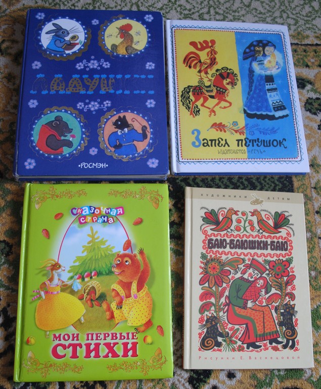 Сборники. Ладушки бука, 2002 года. Много потешек, потом много сказок. Сказки на ТАсю, но она книгу эту не любит. С Юриком потешки читаем. "Запел петушок" был у меня в детстве, оченб книгу сама люблю, Тасе читала, и Юре теперь.