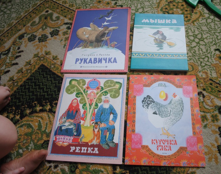 Особые книжки. Воробей и репка ещё из моео детства. Воробей этот не позволил мне взять новую Лабиринтовскую книжку, хотя очень нравится. Репок у нас много, но именно эта раскладушка - самая первая репка всех моих детей. Книга на немецком, но что я, репку не расскажу? Мишка косолапый досталась в наследство от племянников. Нам много чего отдавали для Темы, но большая часть потом ушла в садик. А эта книжка прижилась дома. А теремок - первая книга, которую я купила когда-то для старшего сына. Самая первая... Память.