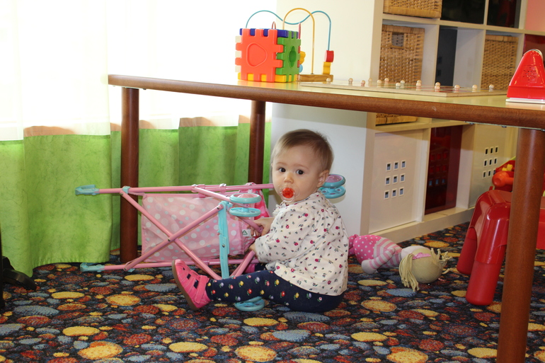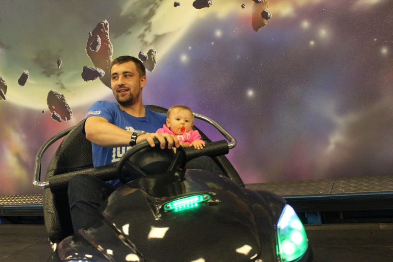 Вообще, конечно, весело ездить в такие места с ползающим ребенком. Выхода два: либо на руках/коляске, либо ищешь поверхность для физической активности. Для нас таким местом оказалась детская игровая комната. Это даже не комната, а зал какой-то)) причем веселее всех там было порой родителям. Разные симуляторы, игровые автоматы, автодром даже