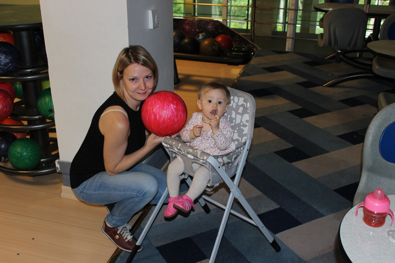 даже на радостях дали возможность пару раз сходить маме с папой поиграть в боулинг и бильярд, правда не надолго, поскольку отпускать её там ползать было проблематично. Это и не чистые полы, а скорее даже грязные, ну для ползанья то)), да и следить за этой маленькой шилопопой нужно зорко, хоть и по очереди) в общем минут 30-40 она высиживала в детском креслице с едой, и небольшими перерывами на физическую активность, а дальше алес - пора валить туда, где чисто))