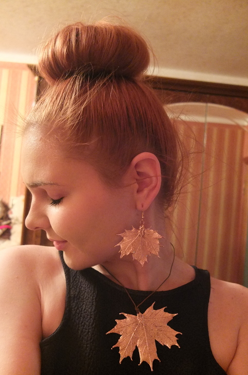 Нарадоваться не могу))) До сих пор не сняла, бегаю периодически к зеркалу, рассматриваю себя)))) А ещё эти украшения постоянно хочется трогать, они такие приятные, все эти прожилочки на листочках, резной край - потрясающе!