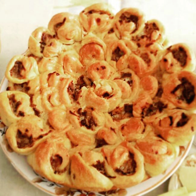 "Пол.литра кефира подогреть в кастрюльке, чтобы был теплый, но не горячий, иначе расслаиваться начнет, снять с плиты и добавить 1-2 ст ложки сахара, 1-2 яйца, 1 ч.л. соды без горки, соли 0,5 ч.л, в это время в микроволновку поставим стакан молока и вскипятим его, добавляем муки 1,5 стакана, перемешиваем всё - сода гасится кефиром и, т.к. он теплый, всё однородное быстро становится, тесто как густая сметана, и туда тонкой струйкой горячее молоко, при этом перемешивая, - т.о. завариваем тесто."