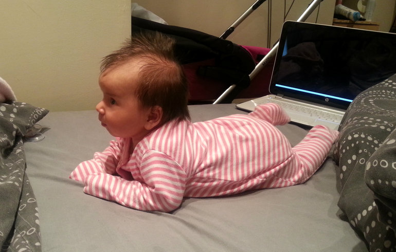 Положила Леруську на животик, а она уже так головку хорошо держит.